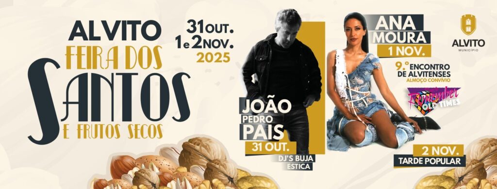 Alvito está em contagem decrescente para mais uma edição da secular Feira dos Santos e Frutos Secos, que decorre de 31 de Outubro a 2 de Novembro. O certame, promovido pela Câmara de Alvito, alia tradição, artesanato, gastronomia, cante alentejano e espetáculos musicais. No cartaz de espetáculos, destaque para a atuação de João Pedro Pais, […]