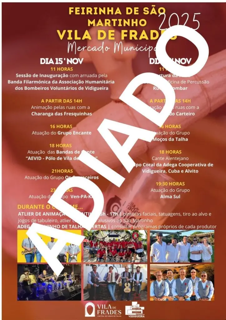 A Junta de Freguesia de Vila de Frades adiou para o próximo fim de semana, de 22 e 23 de Novembro, a a Feirinha de São Martinho, em virtude das más condições climatéricas, que se fazem sentir. O certame vai apresentar-se nos mesmos moldes, no Mercado Municipal, com magusto tradicional, Feirinha de produtos regionais, animação […]